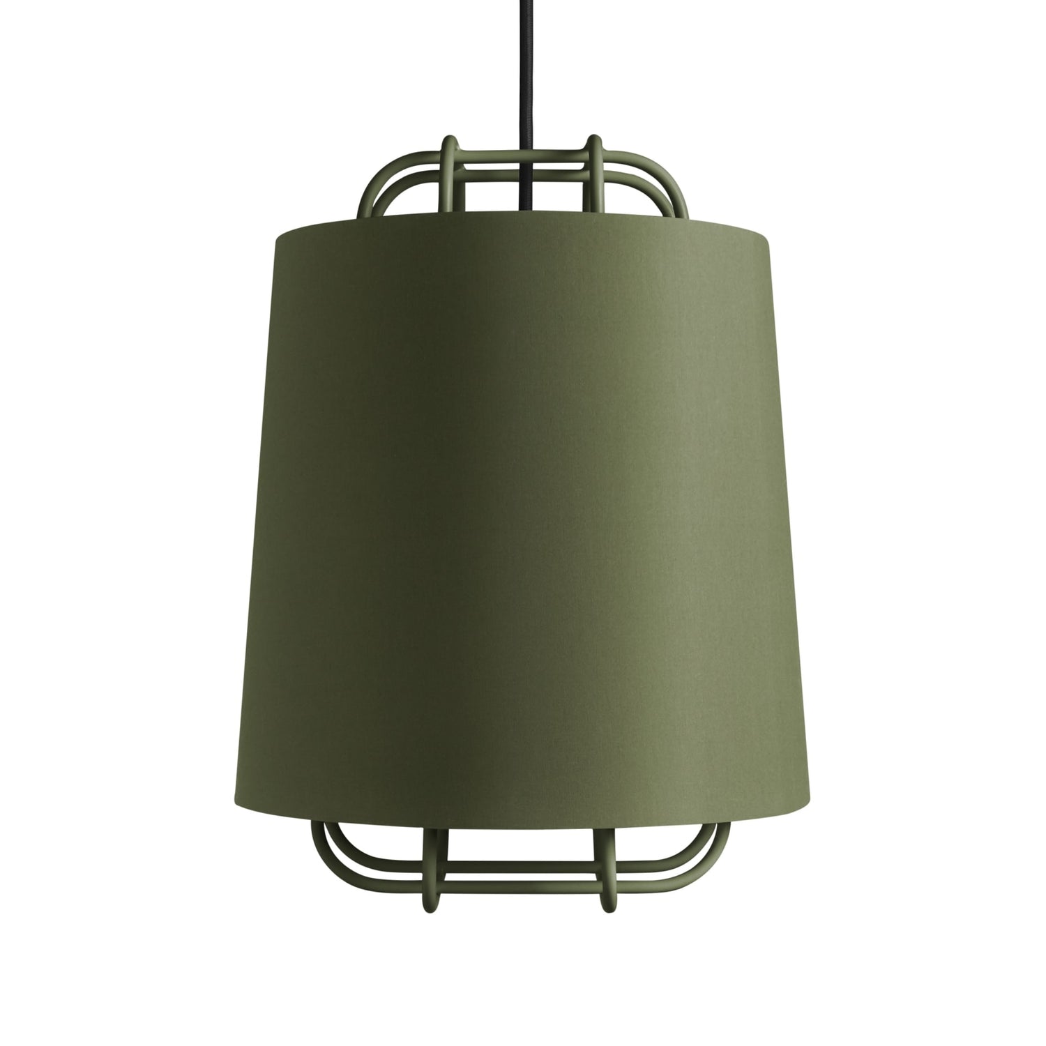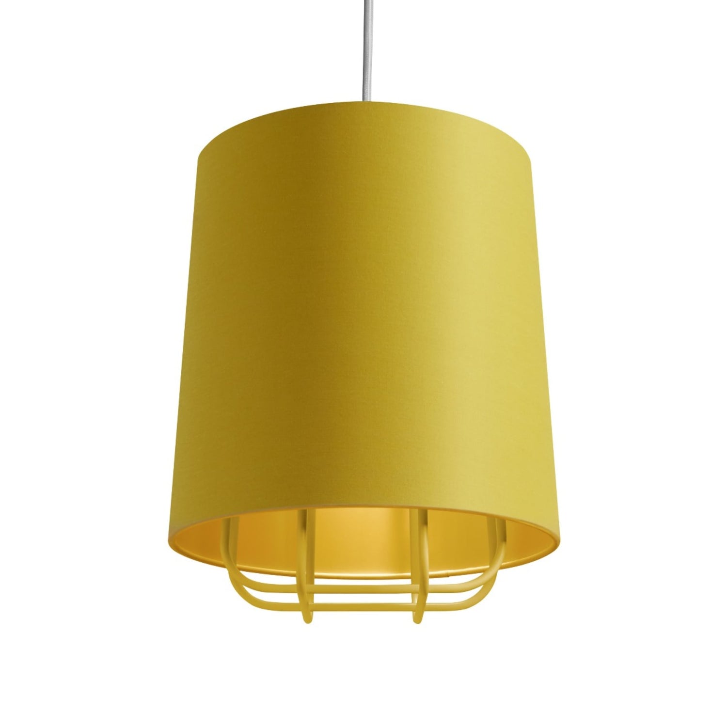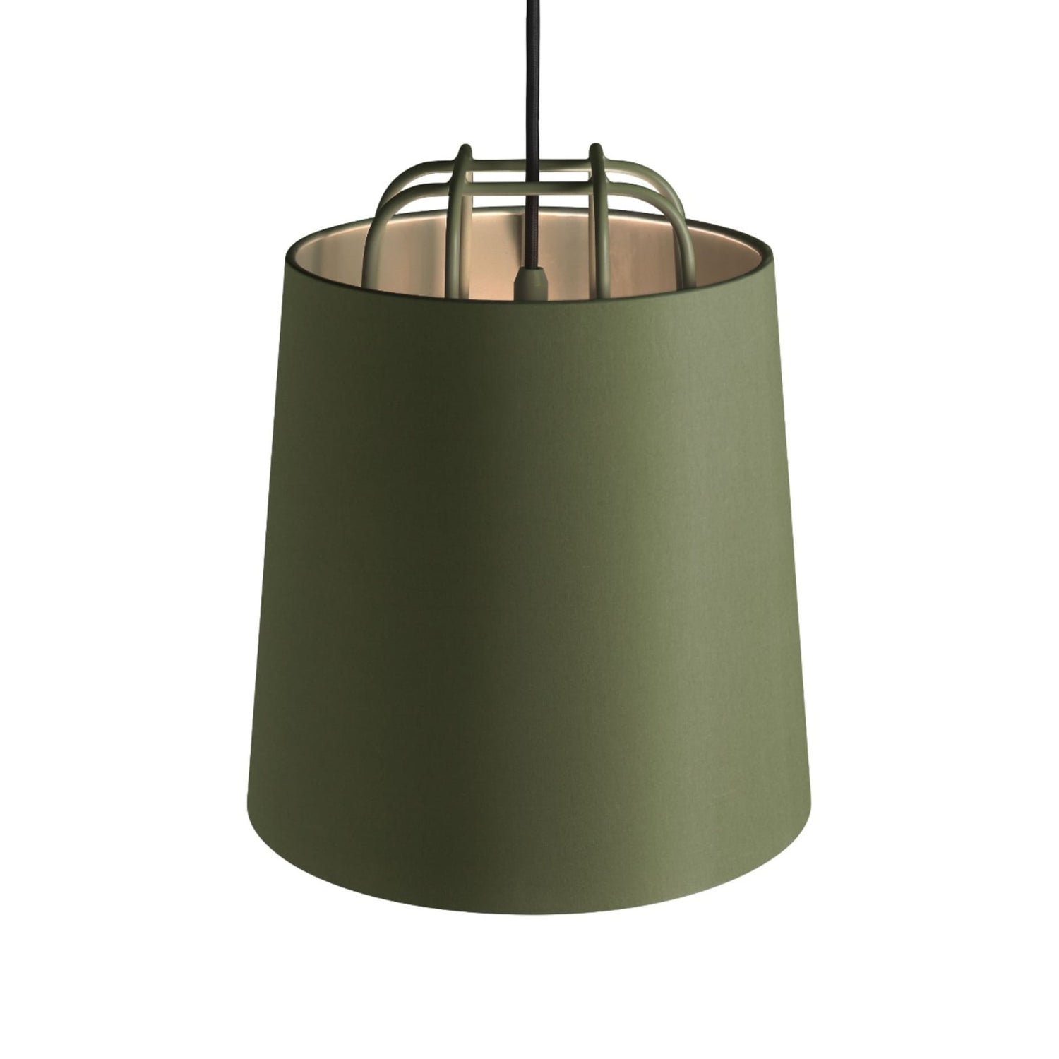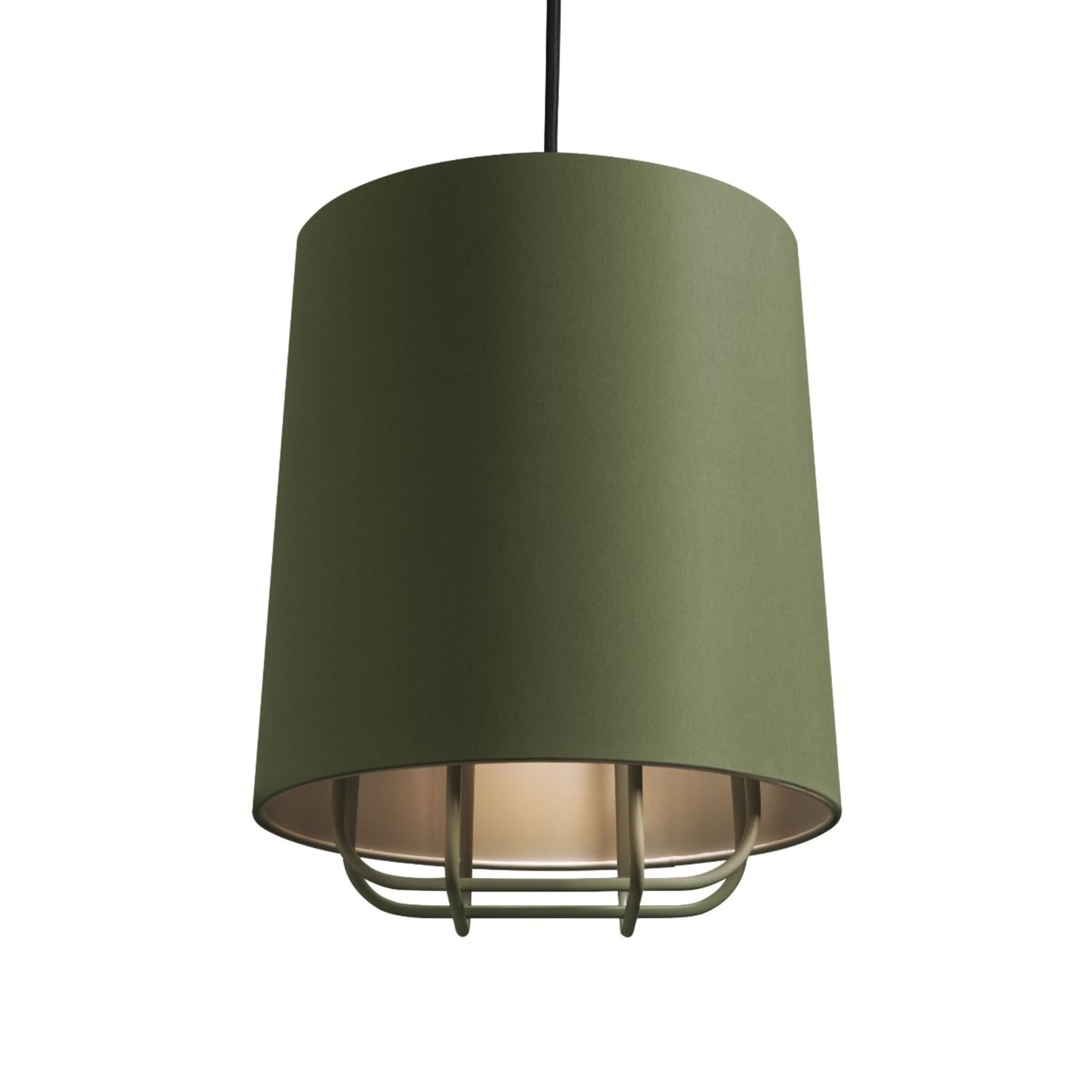 Svelte loops of powder-coated steel hold a cloth-covered shade. Available in a variety of colors to suit your space. Mounts to ceiling.